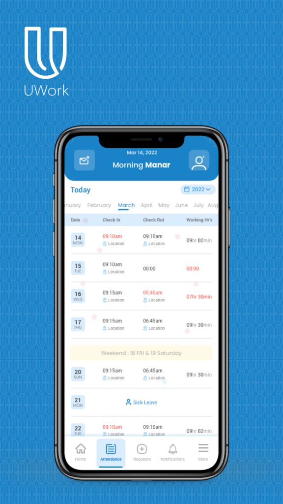 - تطبيق موبايل UWork يتيح تسجيل الحضور وإدارة الإجازات لكلٍ من الموظفين الميدانيين وموظفي المكاتب، ضمن نفس النظام.